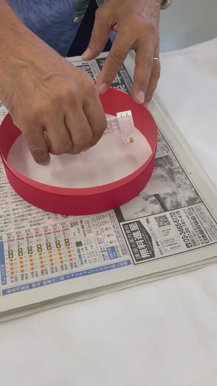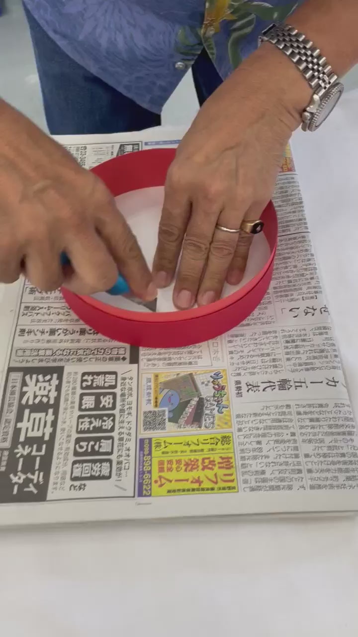 中心部に丸く穴を開け、切り取った断面に好みのテープなどで握りやすくする為に巻いてください。